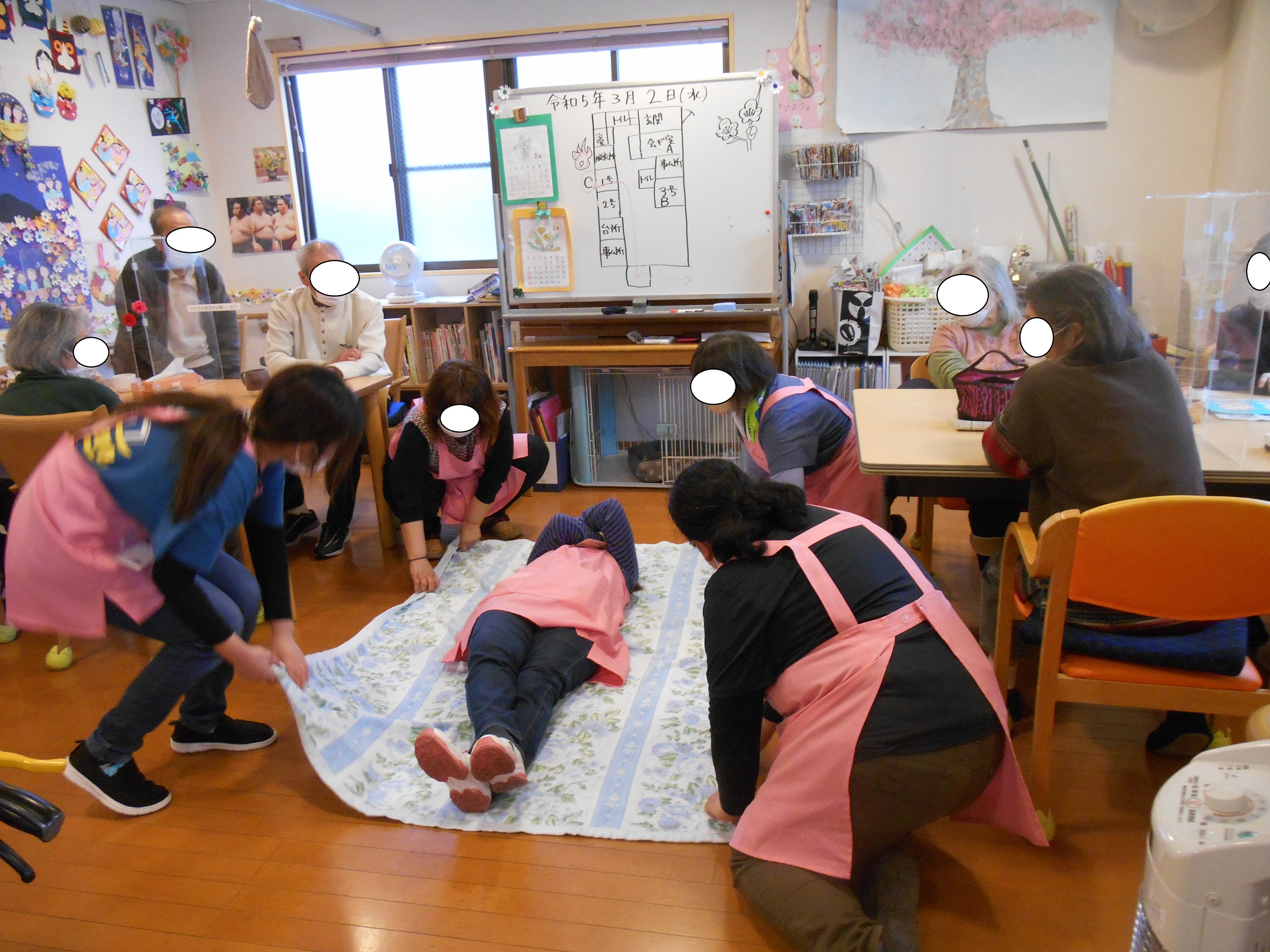 スタッフが前で実践し、自立が難しい方を2名のスタッフで搬送する方法、毛布を使って避離する方法を訓練しました。備蓄食品の試食も行い「昔のカンパンの頃とは違うわね」などの声も聞かれました。