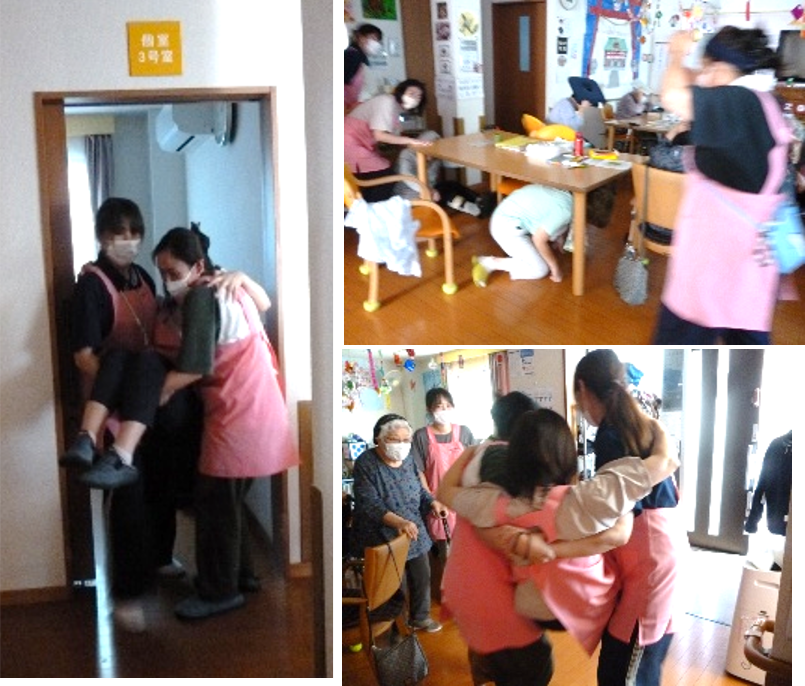 スタッフが前で実践し、自立が難しい方を2名のスタッフで搬送する方法、毛布を使って避離する方法を訓練しました。備蓄食品の試食も行い「昔のカンパンの頃とは違うわね」などの声も聞かれました。