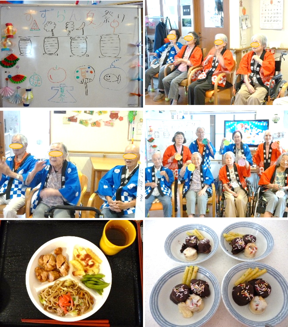 スタッフ手作りヨーヨー釣りは、皆目が真剣になりながら熱中され、釣ったヨーヨーをご自分の手首に巻いたりしていらっしゃいました。おやつには手作りチョコバナナをお出しし、とても喜ばれました。
