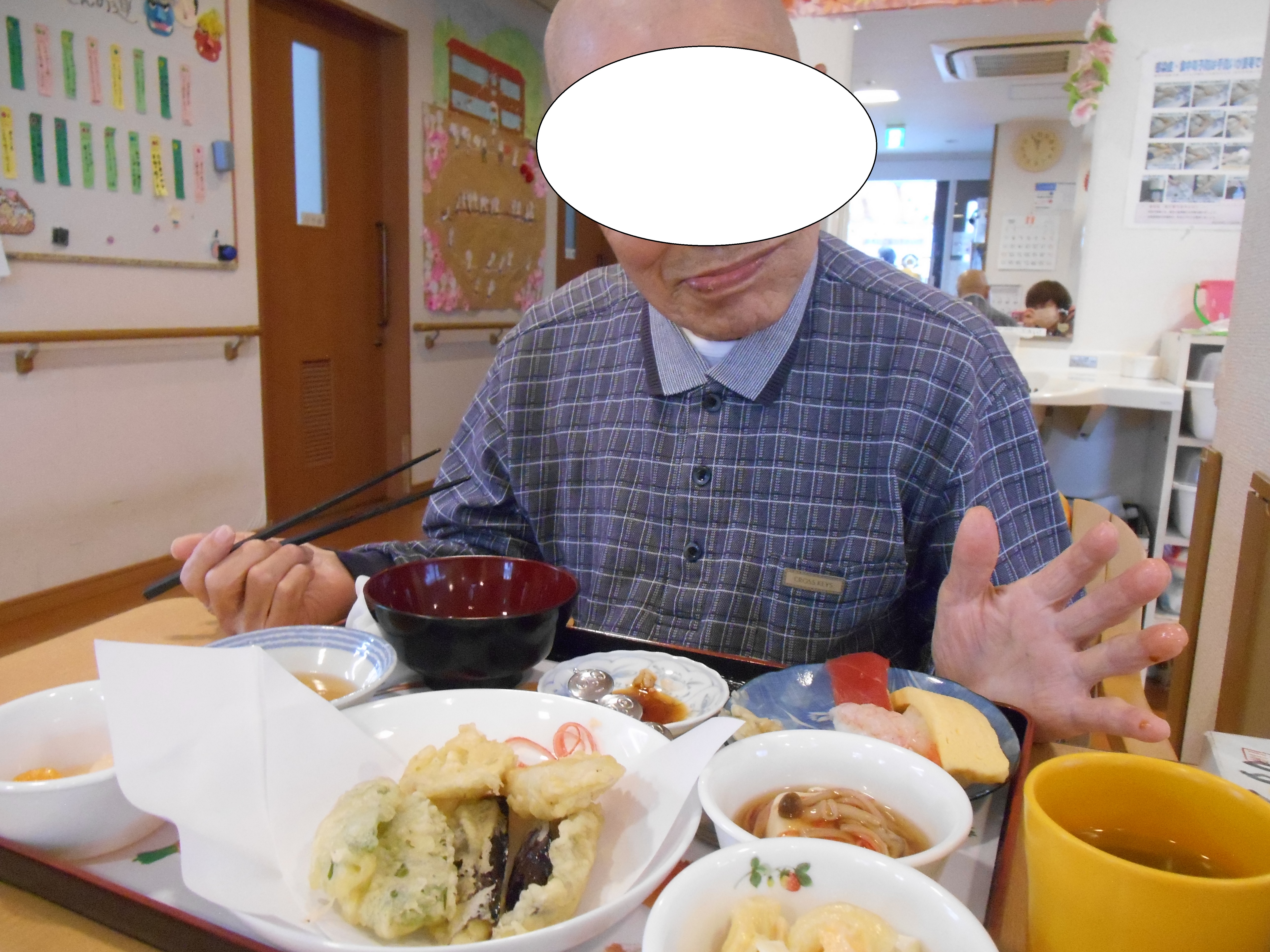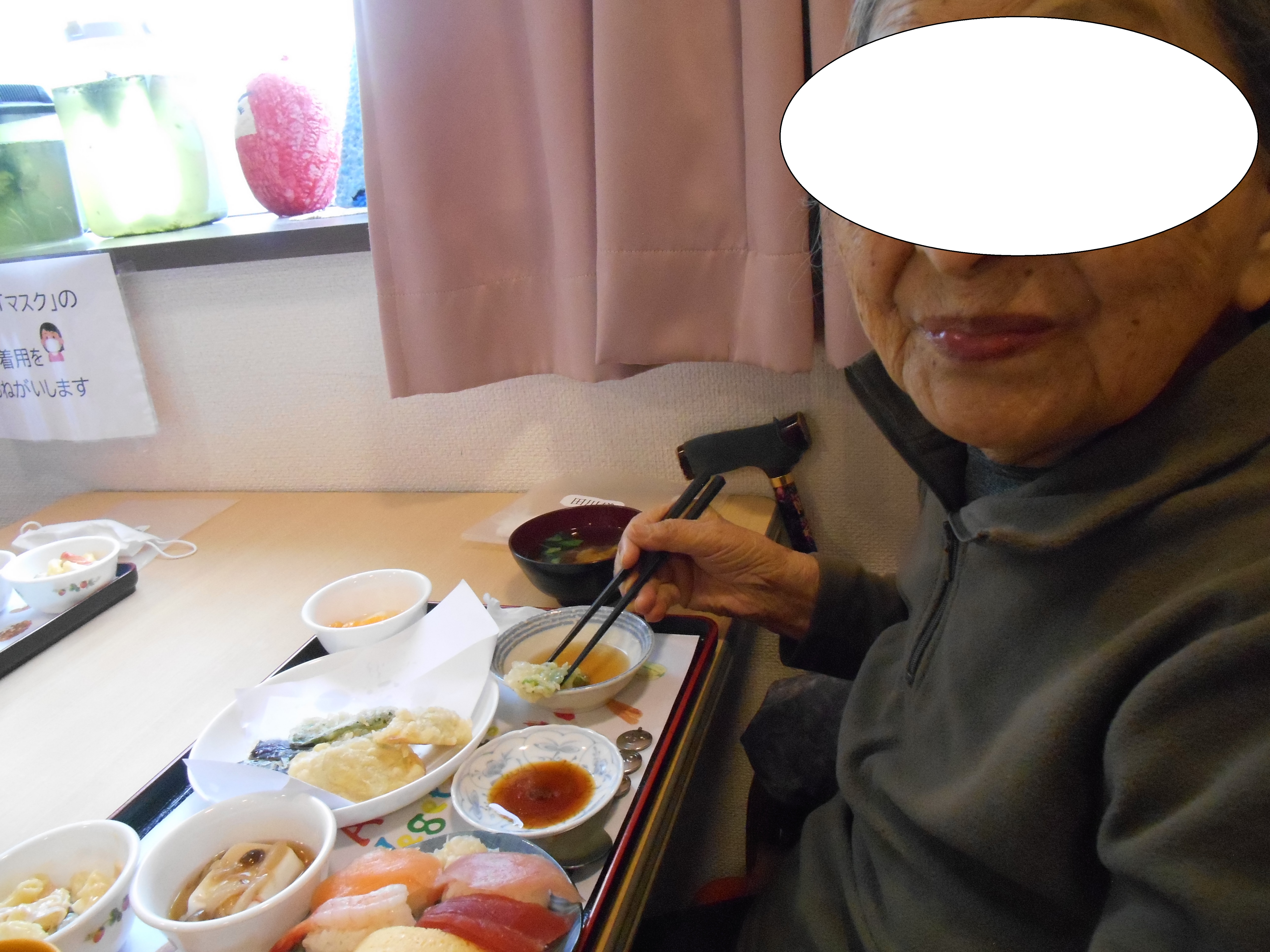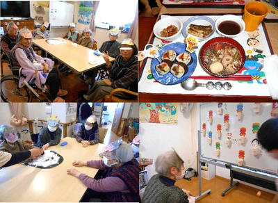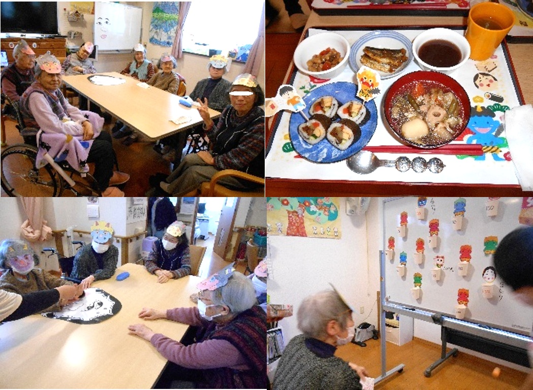 出来上がった顔を見て、利用者様たちは大爆笑!特別食は恵方巻にけんちん汁、イワシの蒲焼など皆さまあっという間に完食されました。午後は射的や玉入れのゲームで盛り上がりました。